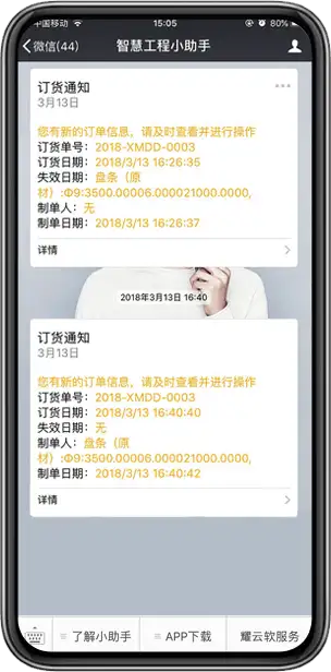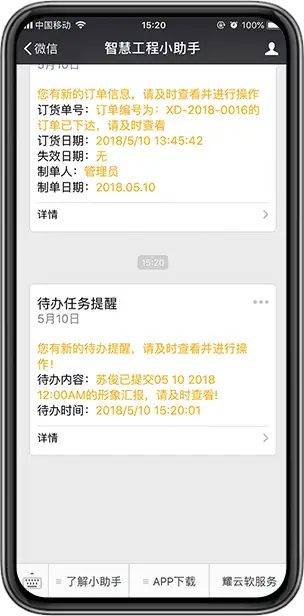通过关注微信公众号,绑定用户名后,就可不用下载APP直接通过微信查看全部项目的进度情况