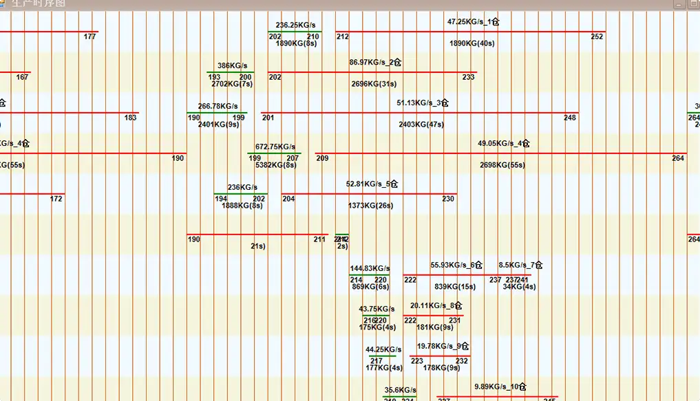生产时序信息全程记录,精确判断每盘混凝土各环节耗时,诊断并警告设备运转耗时节点。当您在按车次统计中点击右键导出生产状态时序图后,可以直观的看到所选定车次的详细生产时序,根据直观的图形数据您可以清楚地了解每个仓门开关所用的时间,可以间接地了解各个设备的健康状况,对开启、关闭或是配料、卸料反应慢的设备及时检修或是升级改良以使设备达到前所未有的高效率。