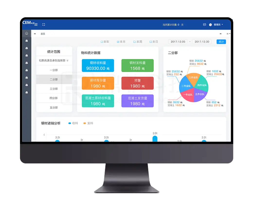 《鼎软CEM混凝土企业管理系统》基于成熟的信息化管理模式与技术手段,将混凝土场站的传统粗放式管理向科学化、信息化转型,把握混凝土场站良性发展的脉络,辅助企业在激烈的竞争中取得先机。CEM系统通过管控混凝土场站各部门(经营、生产、技术、物资、设备、人力资源、账务等),以及相关硬件设备(生产工控机、吹灰口门禁、车辆无线识别、加油机、GPS设备、考勤机等)的接入,实时汇总、处理各项业务,统计、分析各项运营数据,为企业提供有力的实际决策依据。