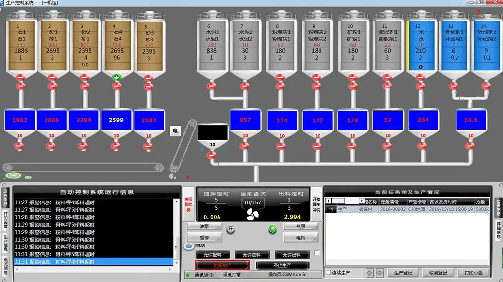 该控制系统控制方式先进、运行稳定、操作简单、功能强大,并且实现了与企业现有搅拌站信息管理系统的无缝对接,系统在上料落差自动修正、误差补偿、扣秤、落差智能修正、多含杂模式自动换算、设定值运行中重置以及手动上料记录方面都取得了显著的突破。生产管理包括生产控制和结构设置,生产控制主要是控制砼生产线的控制中心。人性化操作界面,可根据显示器不同的分辨率自动调整大小至最佳全屏模式,给人以清晰的展示等,实时反映整个砼设备的生产情况。